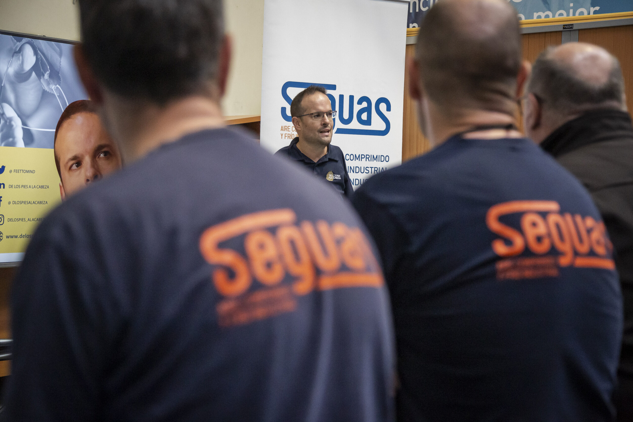 Después de una parte inicial donde la dirección reveló el plan estratégico de Seguas para los próximos años y premió a los trabajadores que más habían destacado en el presente ejercicio, llegó el momento de compartir un mensaje inspirador, que siempre descomprime el aire y nunca deja frío. ‘De los pies a la cabeza’.