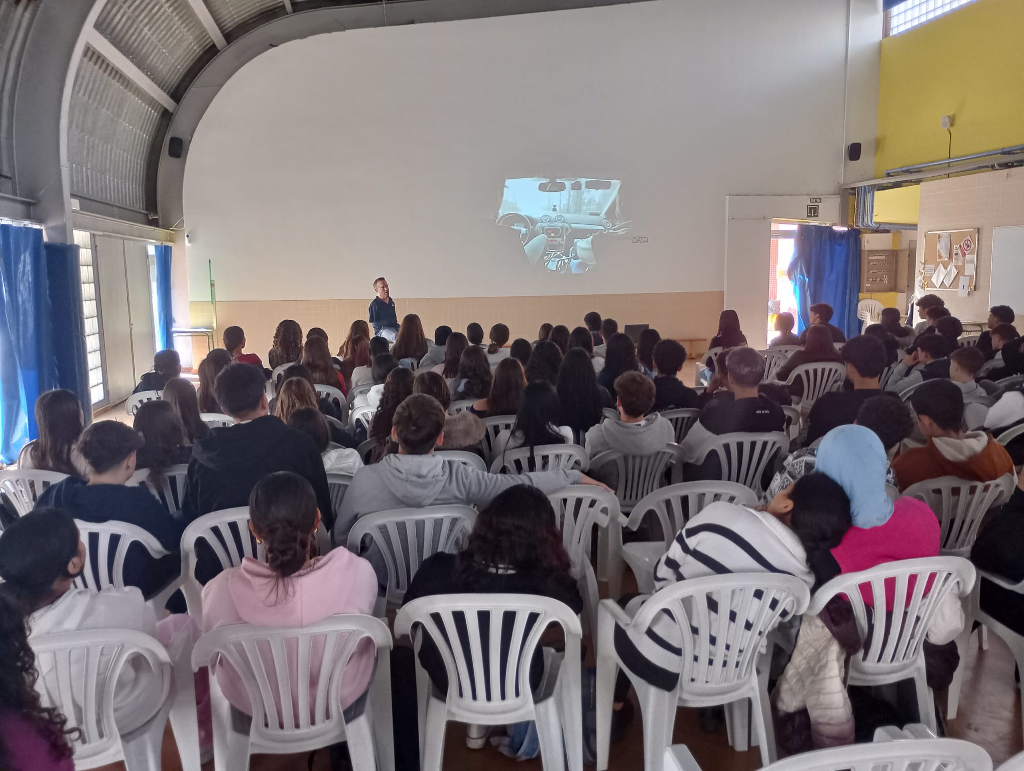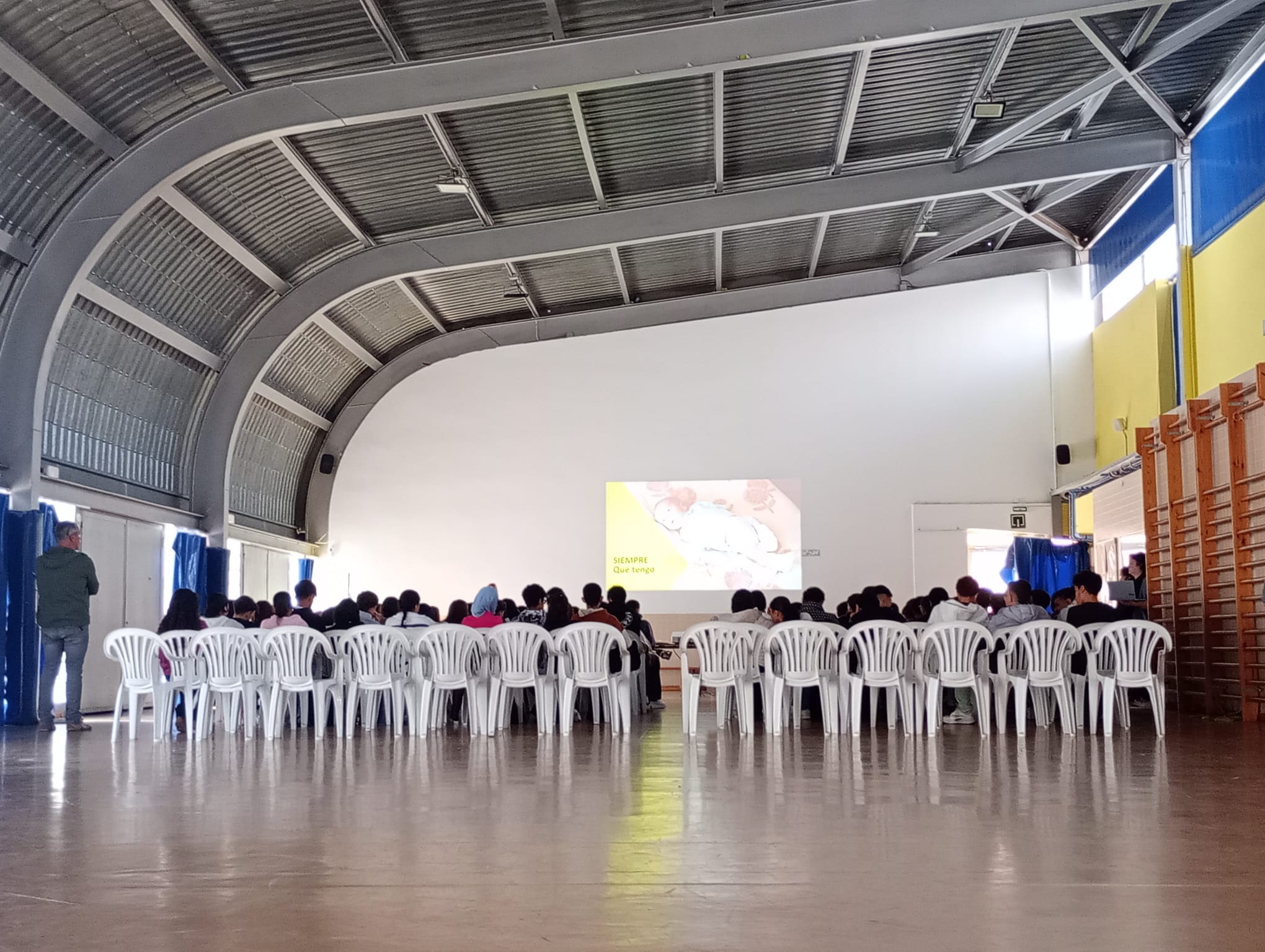 Un centenar de ellos, ahora en 4º de la ESO o en el 1º de Bachiller enfocado a la Economía, acudieron al mediodía del 13 de noviembre en el pabellón cubierto situado junto a su patio exterior y que suele funcionar también como gimnasio y hasta como espacio para organizar charlas de toda índole.